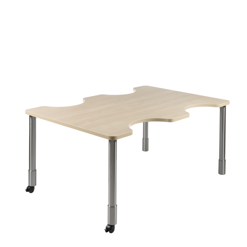 Table de restauration/activité réglable en hauteur pour personnes à mobilité réduite : H 730–830 mm, plateau stratifié 29,4 mm avec chant ABS 2 mm, pieds au choix (noir grainé ou acier brossé). Dimensions : L 1620 × P 1100 mm • Poids 27 kg. Option : lot de 2 pieds sur roulettes.